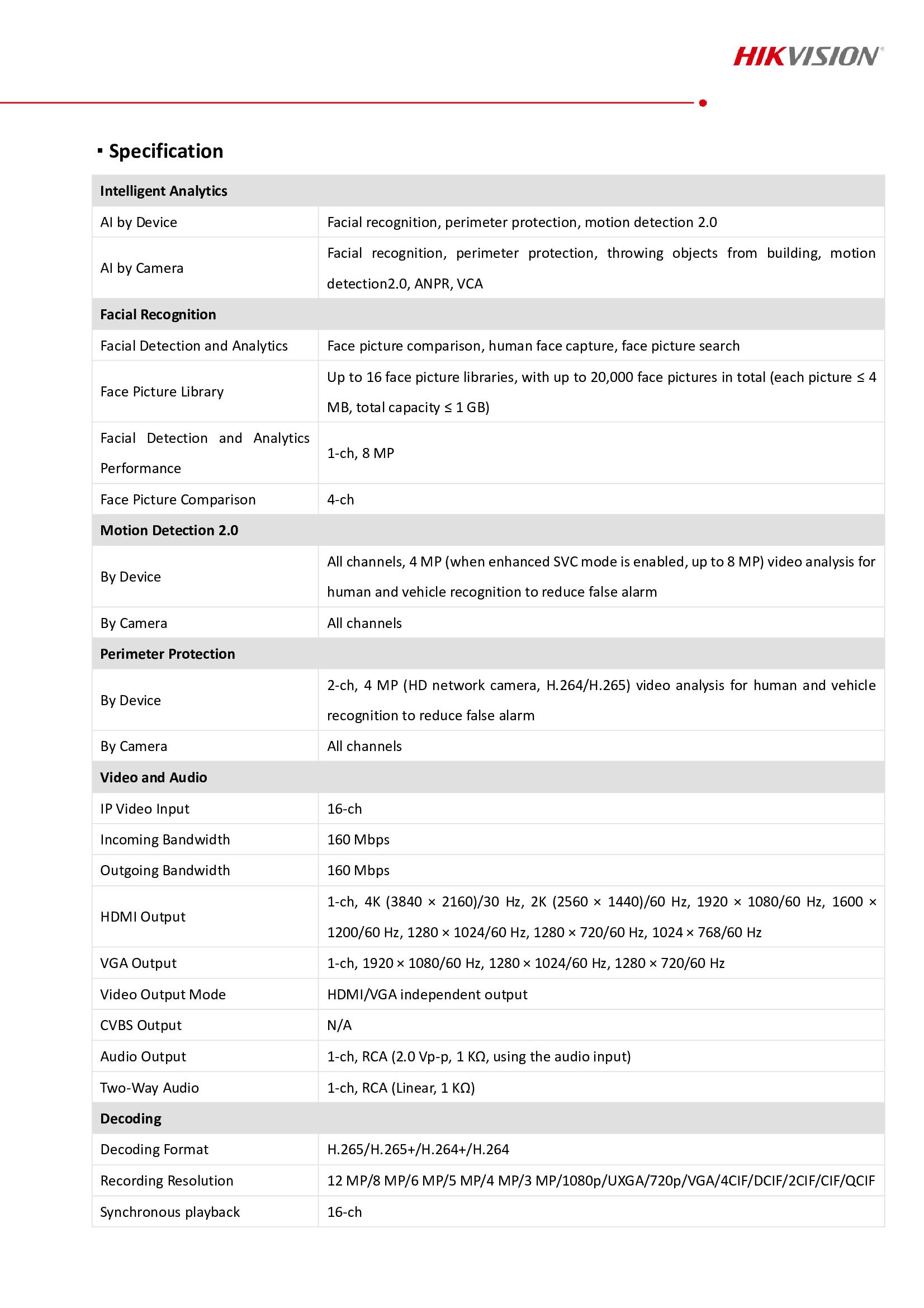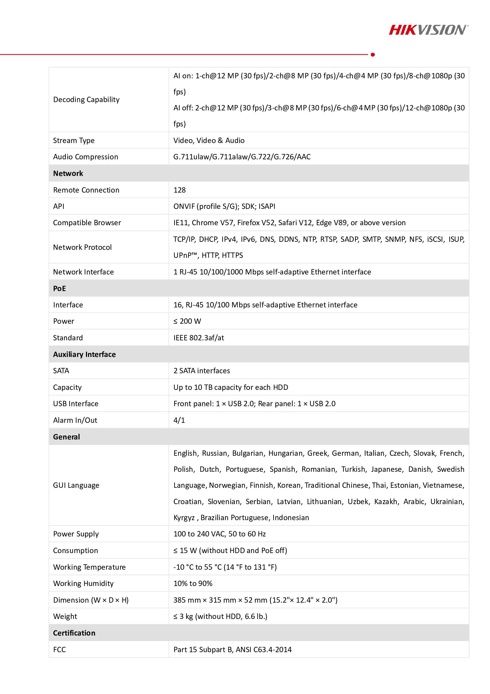 المواصفات الفنية لـجهاز تسجيل nvr هيكفيجن 16 قناة PoE 4K AcuSense :