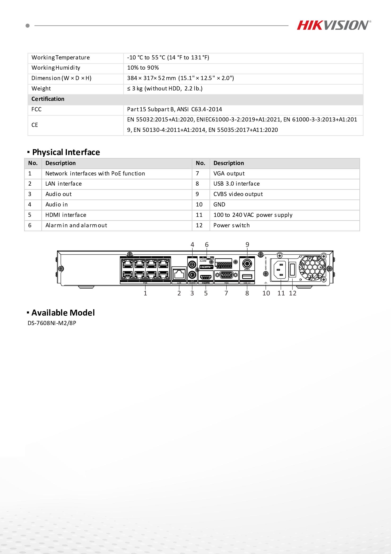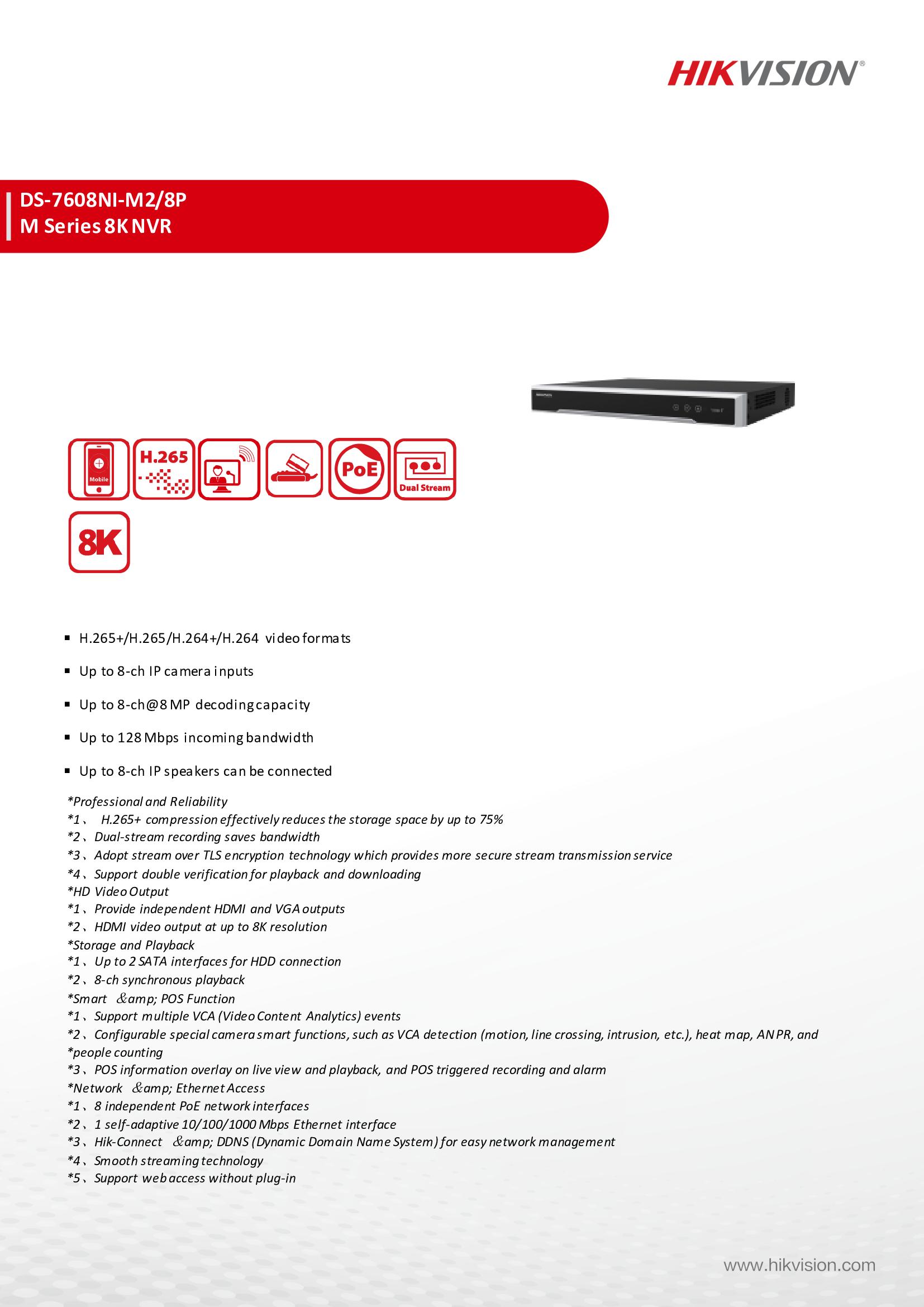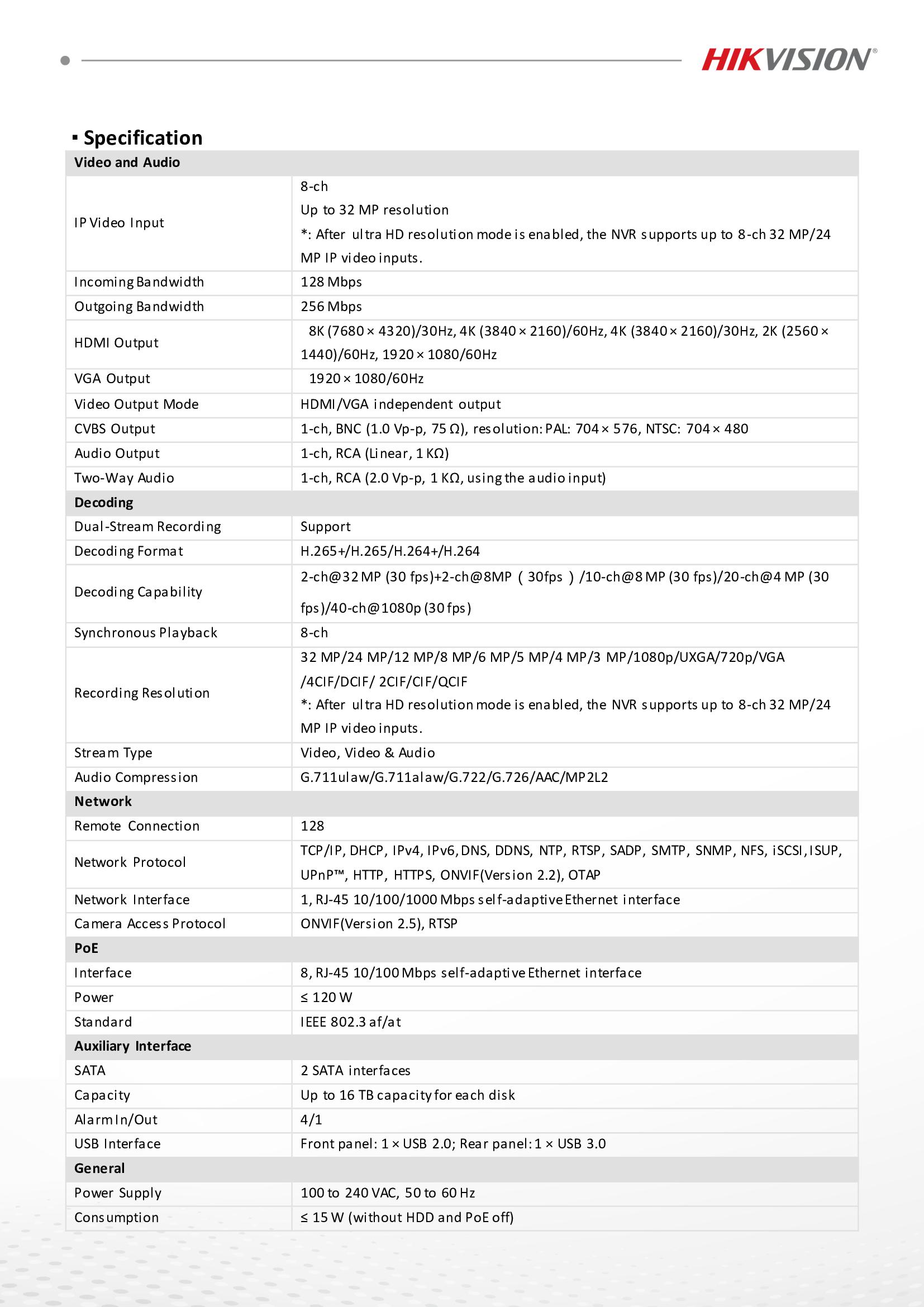 المواصفات الفنية لـجهاز تسجيل nvr هيكفيجن 8 قنوات مع منافذ PoE مدمجة :